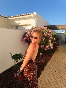 The flare leg elongates, the cropped sweater defines waist, and the blush tone brings warmth to the cool denim. It is casual without being careless, considered without being stiff. The brown boots ground the look, completing a silhouette that moves through the city with quiet assurance.