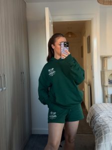 The beige blazer draped over shoulders transforms a casual ensemble into something editorial. Beneath it, a cream fuzzy sweater with cutout detail meets a denim mini skirt—a play on proportion that balances coverage and exposure. The knee-high boots in matching beige create a column of color, elongating the leg.
